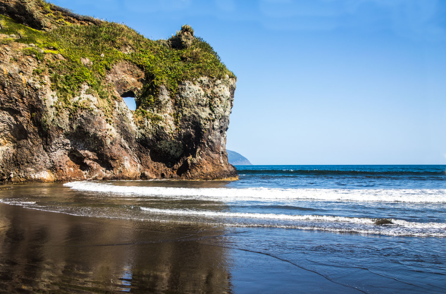 Приготовьтесь попасть на другую планету! Пляж Курильского залива — это застывшая вулканическая лава, образовавшая почти марсианские пейзажи. Инопланетные виды дополняют таинственные силуэты чёрных скал на берегу океана. Удивительно, но даже через лавовую мёртвую прослойку кое-где пробивается зелёная трава и жизнелюбивые цветы.