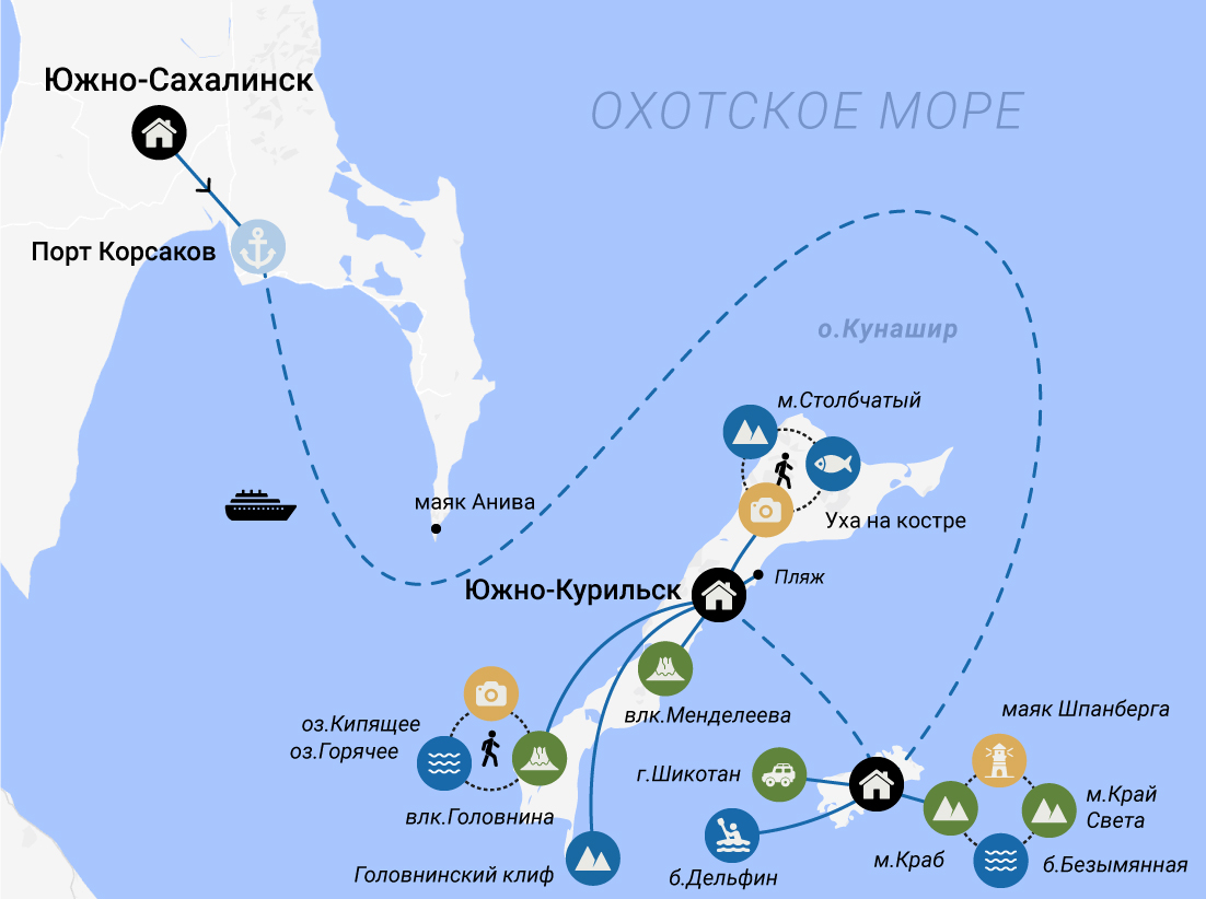 Вас ждёт знакомство с душой и сердцем Сахалина ‒ двумя островами Курильской гряды ‒ Кунаширом и Шикотаном. Вы будете исследовать их на теплоходе, джипах, каяках и, конечно, своих двоих :)