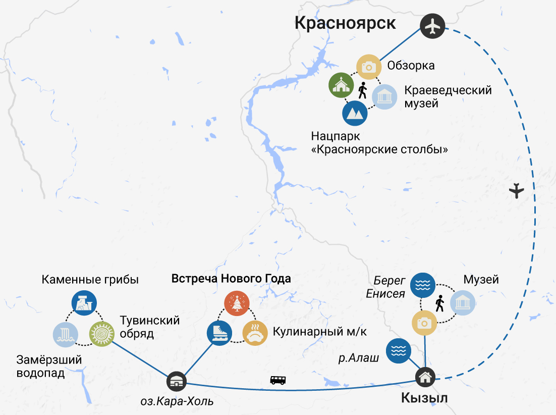 В этом путешествии мы исследуем культуру тувинцев — побываем в музеях и знаковых местах Красноярска и Кызыла, насладимся традиционной кухней, узнаем, как жили люди в этих суровых краях раньше, и посмотрим, как живут сейчас.