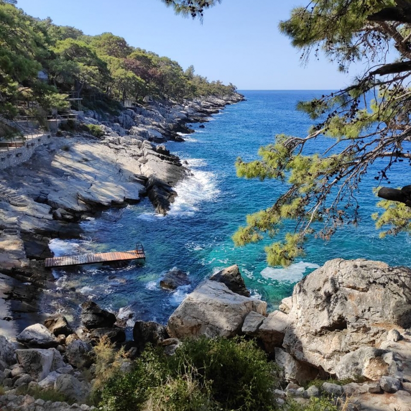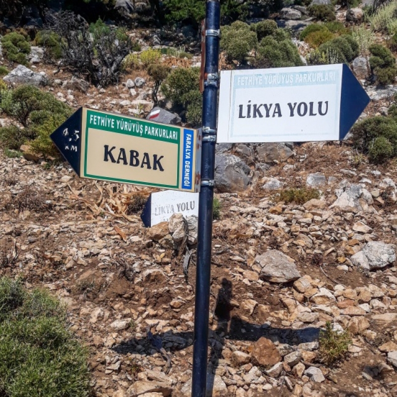 И снова в путь. Спускаемся вниз и идём по тропе с весёлым названием Кабак. По-турецки «кабак» — это тыква. Видимо, форма бухты навеяла жителям такую ассоциацию. Тропа тянется вдоль побережья, так что берём с собой купальники и используем каждую возможность окунуться в бирюзовое море. На пути нам встретится очень красивое место — пляж посёлка Акбурун, что переводится как «белый камень». Белые каменные плиты уходят в глубь воды и создают идеальные площадки для купания. Там же устроим обед и отдых.
