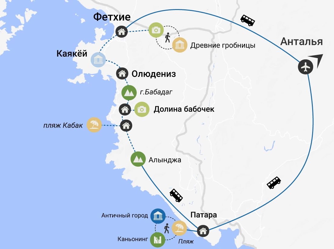 Сегодня мы проведём день в Олюденизе! Этот чудесный курортный городок может порадовать вас развлечениями на любой вкус: недорогой шопинг, отдых на уютном пляже и купание в голубой лагуне, параглайдинг для любителей экстрима, катание на квадроциклах, каяках и сапах, прогулки на лошадях, вкуснейшие ресторанчики с морепродуктами, прогулки на яхте с остановками на необитаемых островах и купанием в открытом море, расслабляющие хаммамы и массажи — каждый найдёт здесь себе отдых по душе.