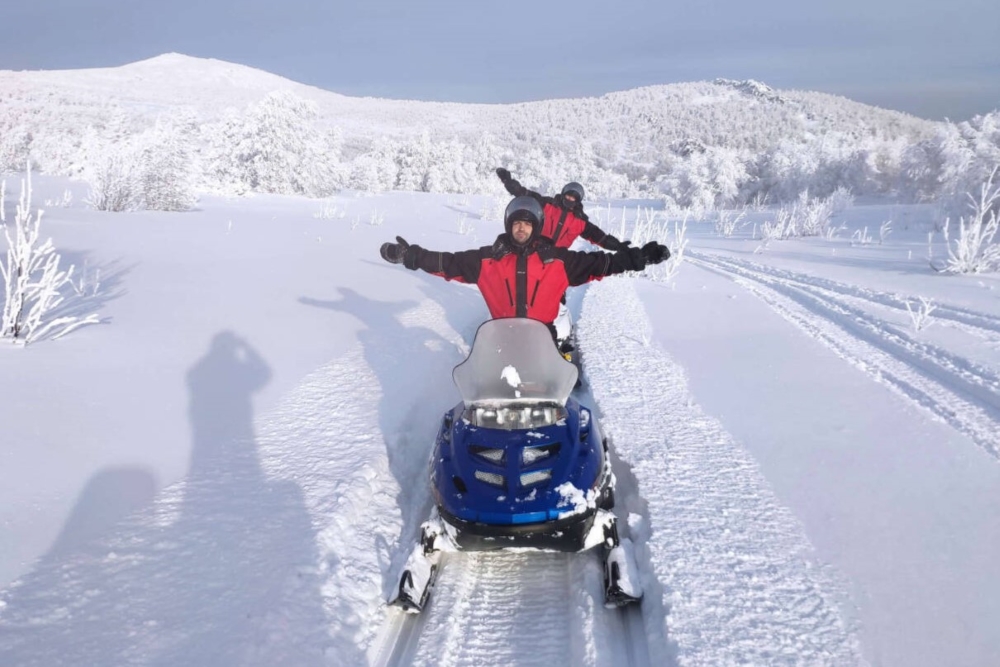 Пересаживаемся на снегоходы! Для вас проведут инструктаж и выдадут всю необходимую экипировку: непродуваемый комбинезон из мембранной ткани, тёплые рукавицы и бахилы.