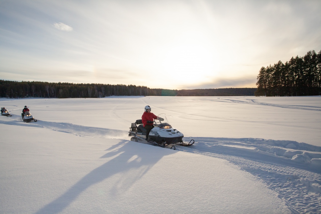 После обеда для всех участников — инструктаж и подбор экипировки. Затем вас ждёт небольшая прогулка на снегоходах по окрестностям села Кага: проедете с ветерком по зимнему лесу и полюбуетесь настоящей уральской зимой.