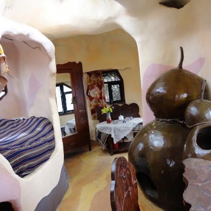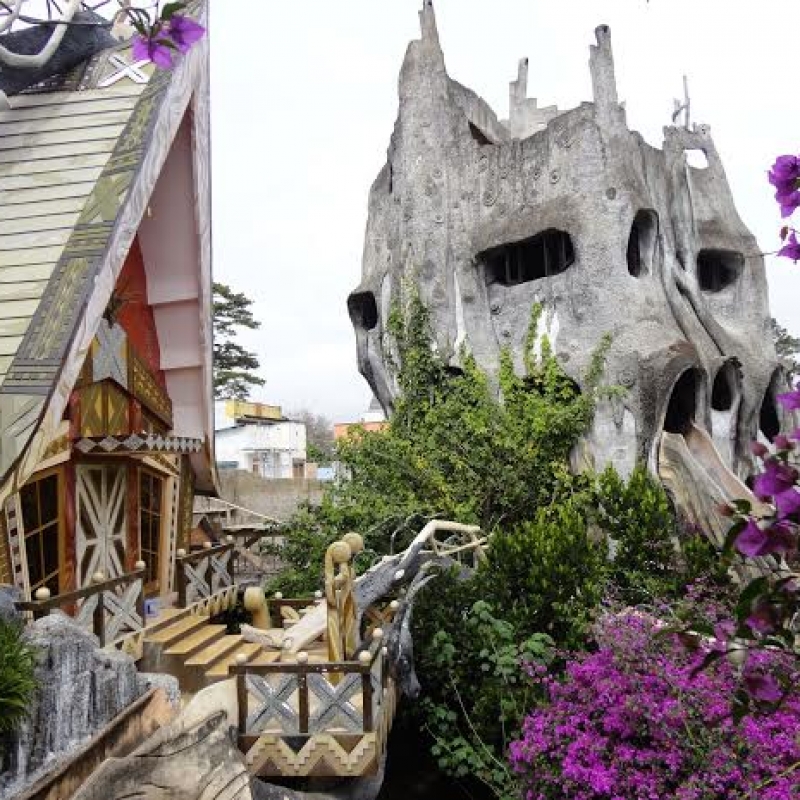Следующая остановка нашего путешествия — здание, известное в народе как «Сумасшедший дом». Это одновременно и гостиница, и кафе, и художественная галерея. Здесь есть пещеры, гигантские паутины, сделанные из проводов, бетонные «стволы деревьев», одна обнажённая женская статуя (редкость во Вьетнаме), и даже жираф (со встроенной внутри чайной комнатой).